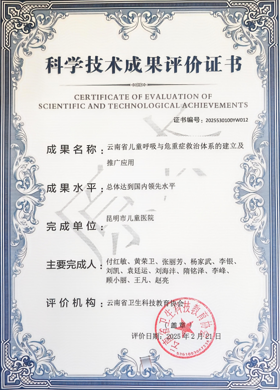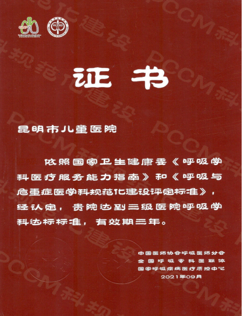云南省卫健委2018年省级临床重点专科、昆明市儿童疑难呼吸系统疾病诊治中心,全国首个通过中国医师协会 PCCM 专科认证的儿童专科;