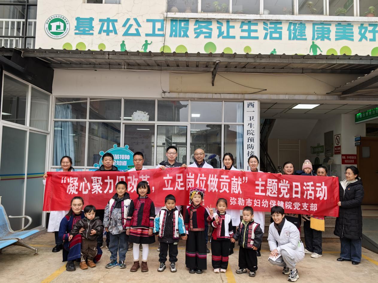 为深入贯彻落实新时代党的卫生健康工作要求,扎实推进优质医疗资源下沉基层,持续巩固民族团结进步创建成果,2026年1月22日,昆明市儿童医院儿内综合科党支部赴弥勒市开展主题党日活动,与弥勒市妇幼保健院党支部联合开展“凝心聚力促改革,立足岗位作贡献”主题实践,并举行“昆明市儿童医院刘凯博士专家团队工作站”授牌仪式,随后深入西一社区开展义诊服务与健康宣教,把关爱儿童健康的实际行动落到基层一线、落到各族群众家门口。