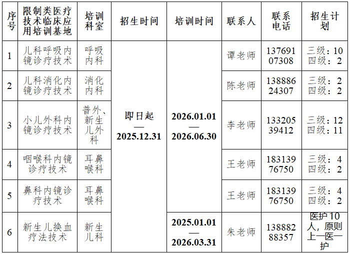 1.儿科呼吸内镜诊疗技术、儿科消化内镜诊疗技术、小儿外科内镜诊疗技术、咽喉科内镜诊疗技术、鼻科内镜诊疗技术培训6个月:2026年1月1日—2026年06月30日;
