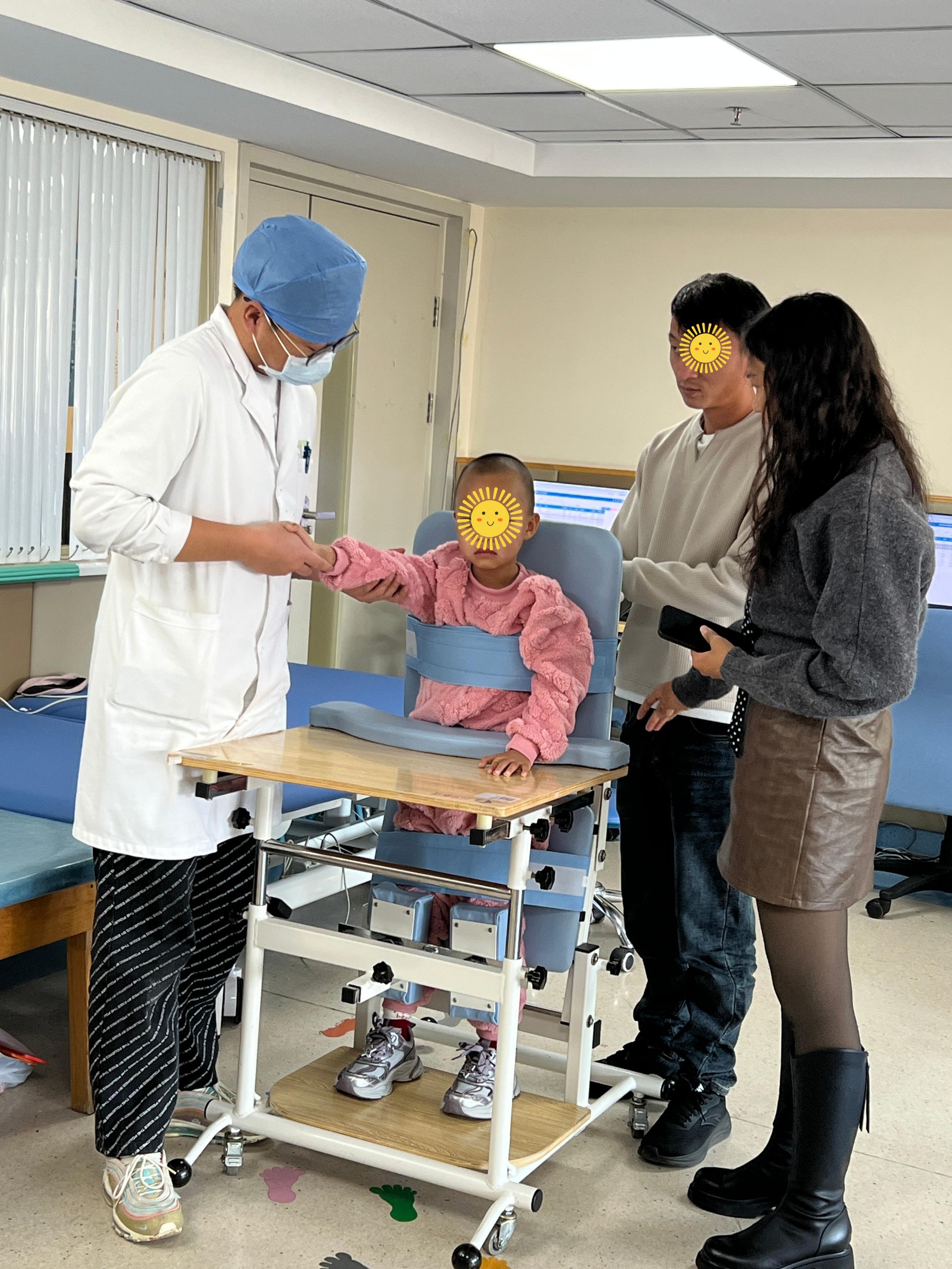 随后,医生及治疗团队为只建琪定制了专属康复方案,从被动按摩、关节活动度训练,再到逐步引导进行坐位平衡、站立训练,每一步都倾注了医护人员的心血。治疗过程中,康复科的医务人员时刻关注孩子的情绪变化,用耐心和鼓励帮助他克服训练的疲惫与畏难。